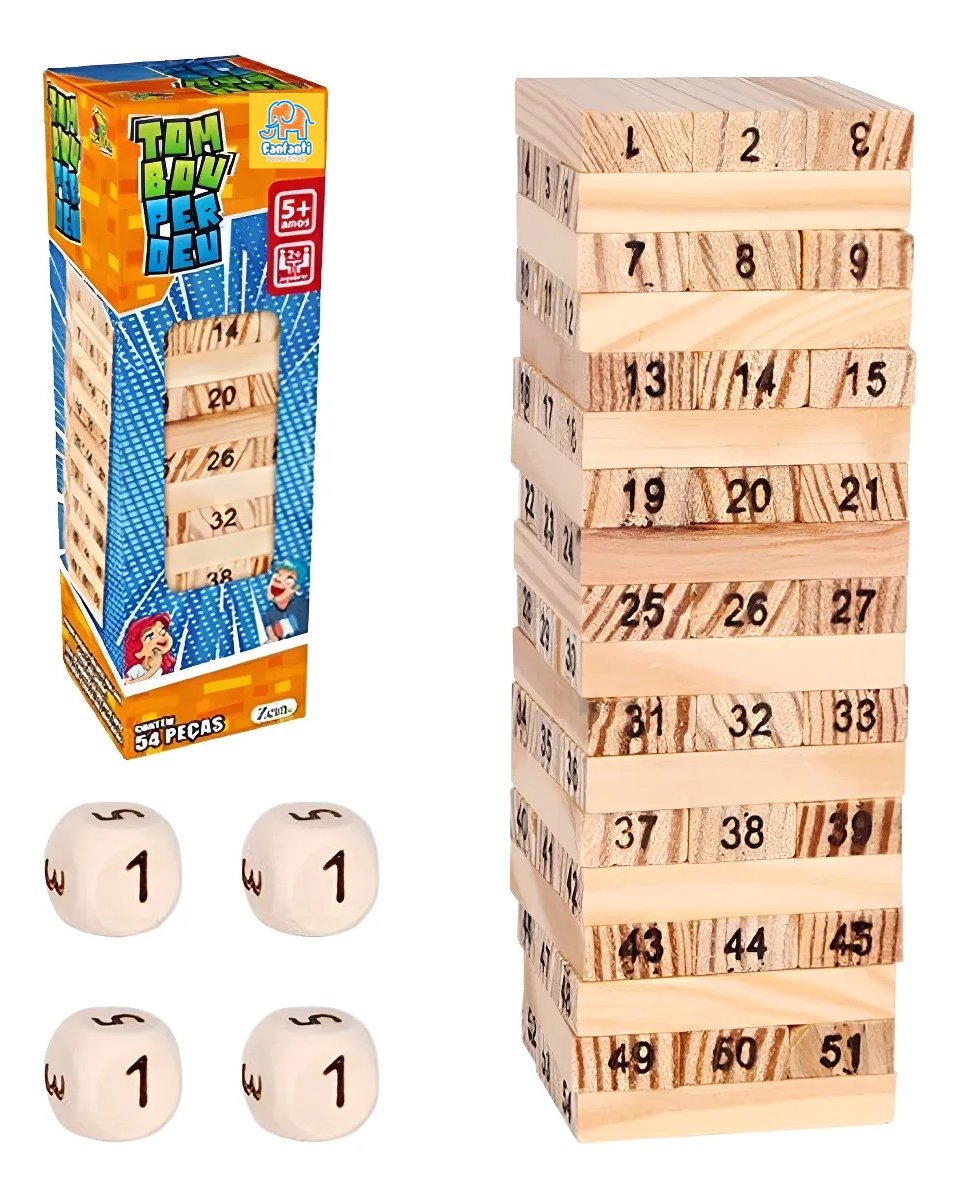 Feito com blocos de madeira numerados, este jogo é ideal para momentos de lazer em família, festas ou viagens.