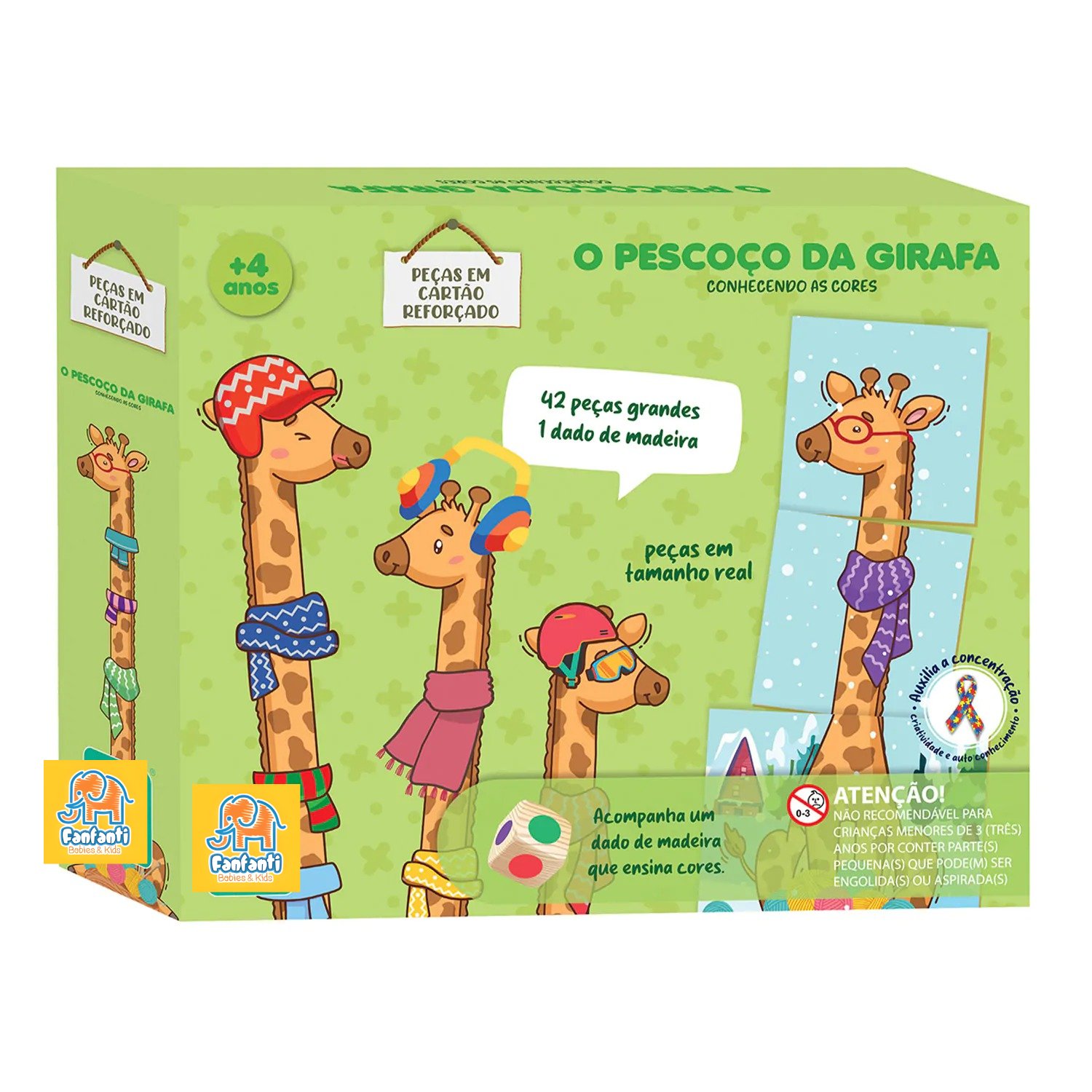 Jogue o dado, vire a peça com a cor sorteada e construa sua girafa. A peça da cabeça vai “trancar” o seu jogo!