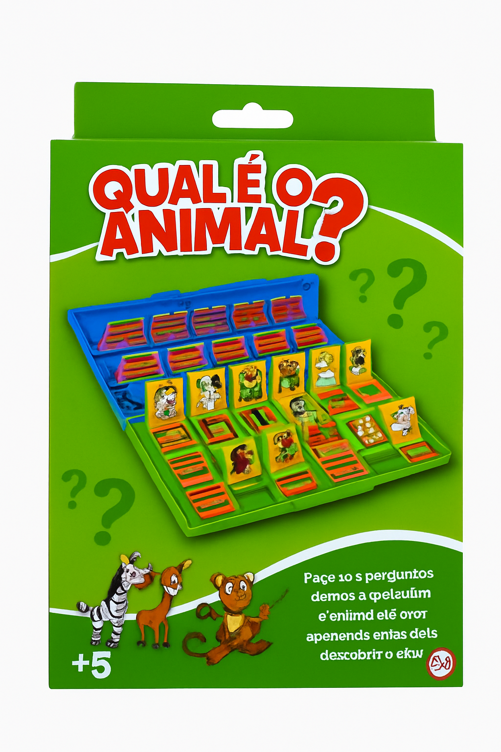 O jogo Qual é o Animal? traz cartas ou figuras com diferentes animais, onde a criança deve descobrir qual é o animal certo por meio de pistas, observação e dedução. É perfeito para desenvolver vocabulário, estimular a fala e incentivar a curiosidade natural das crianças sobre a natureza.